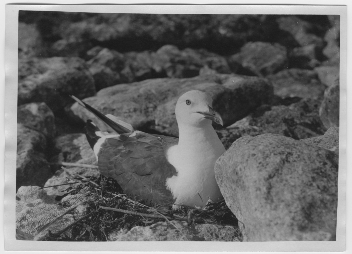'Sillmås, ruvar, liggande på boet bland stenblock. Sedd snett framifrån. Närbild. :: Se fotonr 2467, samma motiv. :: :: Ingår i serie med fotonr. 2462-2487.'