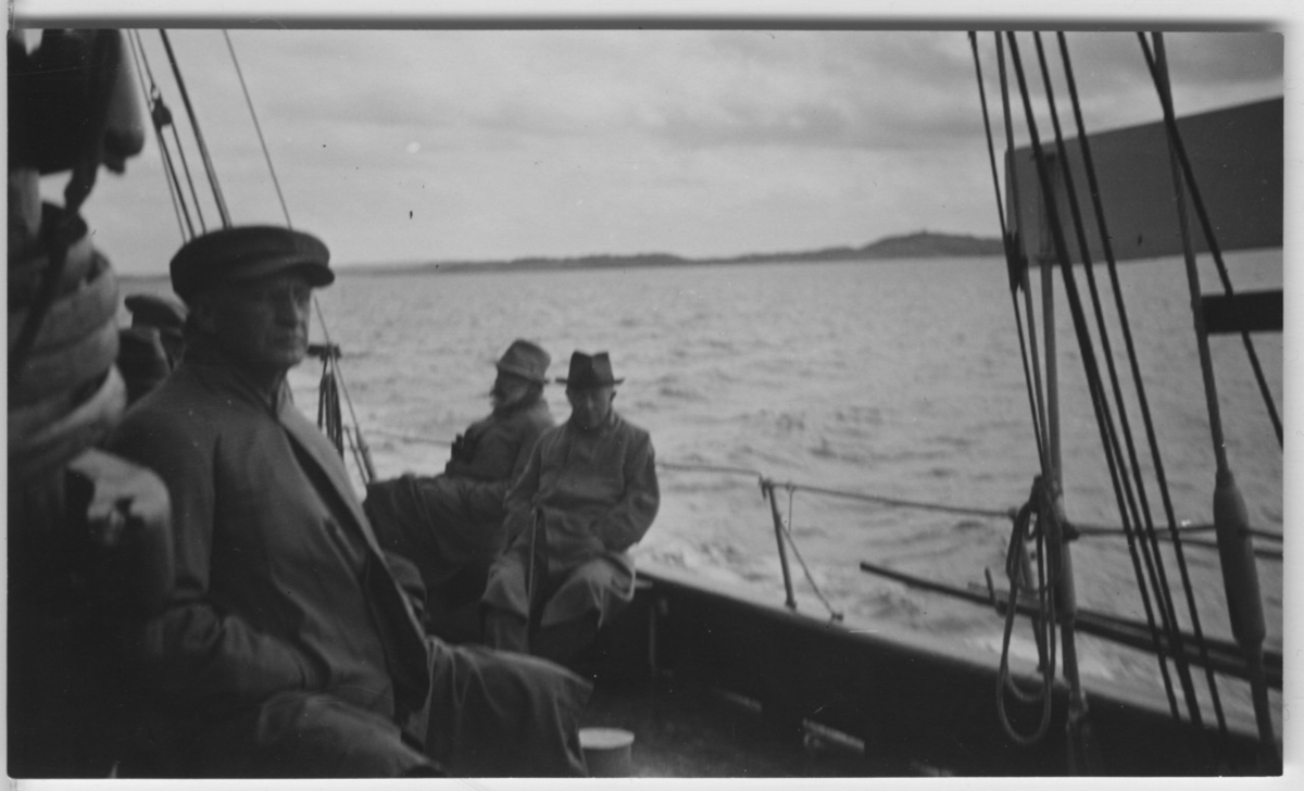 'Göteborgs Biologiska förenings utfärd till Fjärås-Onsala-Nidingen-Malön-Kalvön: :: :: 3 st män vid relingen på en båt, på Kungsbackafjorden :: :: Se fotonr. 2489-2500 och 2501-2515 från samma utfärd.'