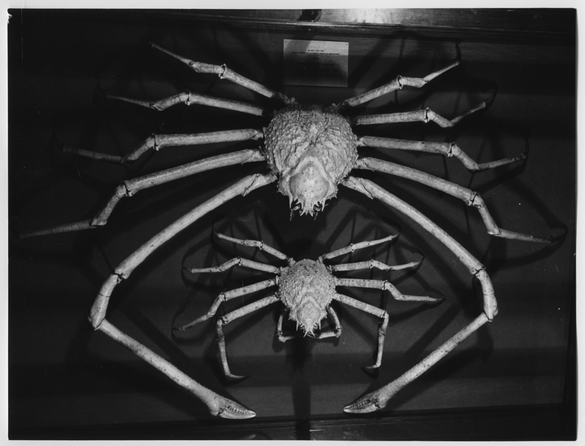 'Bilder från Göteborgs Naturhistoriska museum tagna som övningsuppgift av fotografer på Göteborgs Stads yrkesskolor: :: :: 2 st japanska jättekrabbor, hane nederst och hona överst. I monter nr. 94 (år 2007). :: :: Ingår i serie med fotonr. 6953:1-53.'