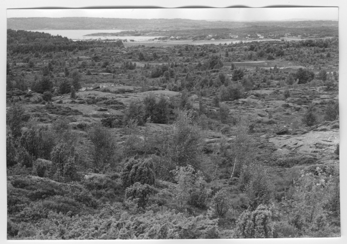 'Bildtext: ''Hällandskap. Riktning 0.'' Vy över berghäll med bl.a. enbuskar, björk och ljungvegetation. Vattensamlingar i lägre partier. Vy med havsvik och hus i fonden. :: :: Ingår i serie med fotonr. 6970:1-1125, dokumentation av Hisingens naturgeografi, visande landskapsformerna i stora drag och gjord inför exploateringen av området. Platserna för fotograferingen finns utsatta på karta i skala 1:4000 som finns på Göteborgs Naturhistoriska musem. Fotoriktningen mättes med kompass i gammalgrader.'