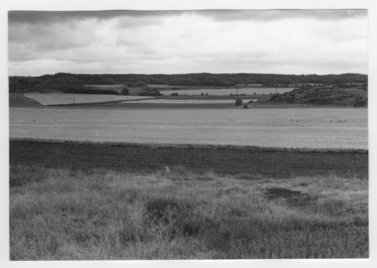 'Bildtext: ''Sedimentyta. Riktning 110.'' Vy över öppna fält, åkrar. På avstånd berghäll. Elledningar. :: :: Ingår i serie med fotonr. 6970:1-1125, dokumentation av Hisingens naturgeografi, visande landskapsformerna i stora drag och gjord inför exploateringen av området. Platserna för fotograferingen finns utsatta på karta i skala 1:4000 som finns på Göteborgs Naturhistoriska musem. Fotoriktningen mättes med kompass i gammalgrader.'