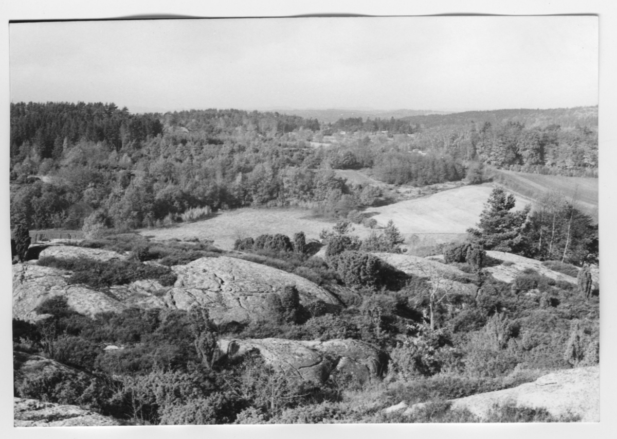 'Bildtext: ''Skogsparti. Riktning 300.'' Vy ned över åkermark och skogsbevuxet berg. :: :: Ingår i serie med fotonr. 6970:1-1125, dokumentation av Hisingens naturgeografi, visande landskapsformerna i stora drag och gjord inför exploateringen av området. Platserna för fotograferingen finns utsatta på karta i skala 1:4000 som finns på Göteborgs Naturhistoriska musem. Fotoriktningen mättes med kompass i gammalgrader.'