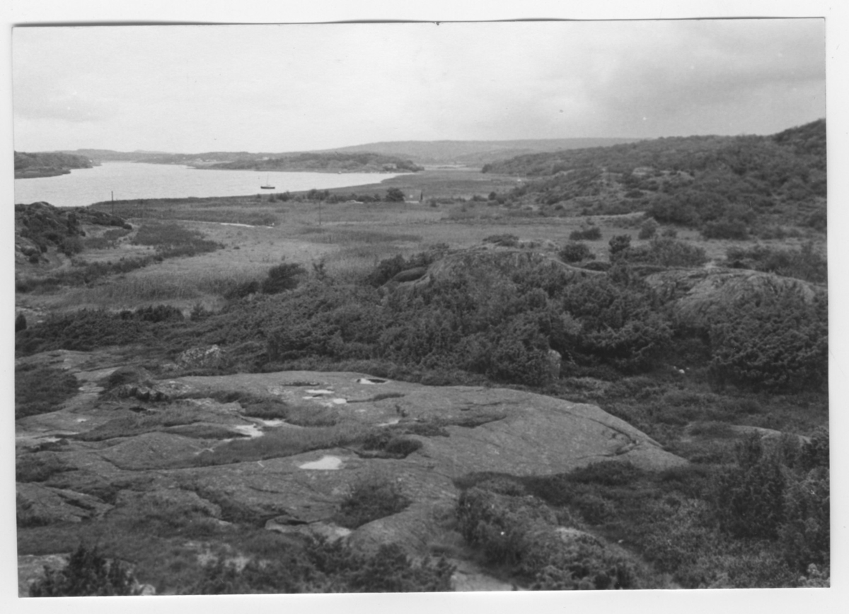 'Bildtext: ''Vassvegetation i strandzonen. Riktning 56.'' I förgrunden berghäll med enbuskar och ljung samt små vattensamlingar. Vy ut över vassbevuxen strandkant och båt i havet. :: :: Ingår i serie med fotonr. 6970:1-1125, dokumentation av Hisingens naturgeografi, visande landskapsformerna i stora drag och gjord inför exploateringen av området. Platserna för fotograferingen finns utsatta på karta i skala 1:4000 som finns på Göteborgs Naturhistoriska musem. Fotoriktningen mättes med kompass i gammalgrader.'