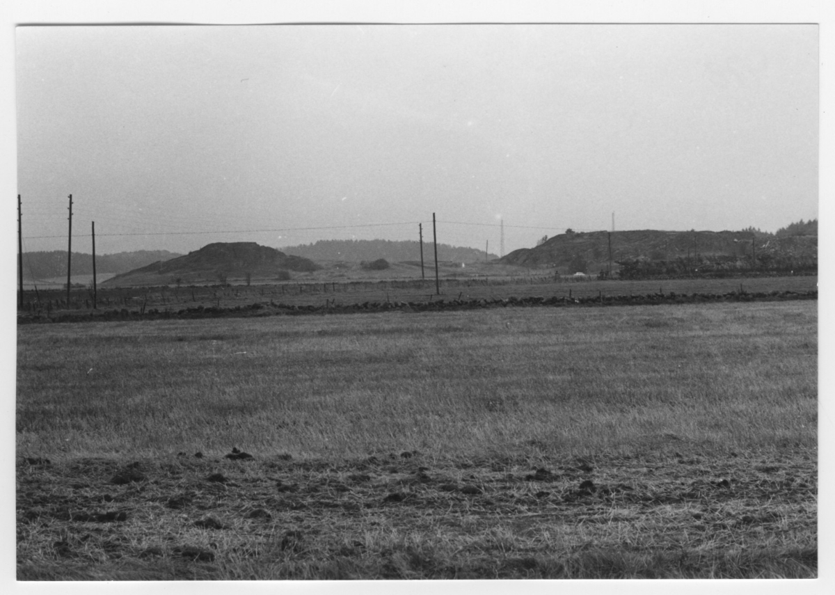 'Bildtext: ''Sedimentyta. Riktning 90.'' Vy ut över öppna fält, åkrar med stenmur. På avstånd uppstickande kalt berg. Elledning. Stengärdesgård. :: :: Ingår i serie med fotonr. 6970:1-1125, dokumentation av Hisingens naturgeografi, visande landskapsformerna i stora drag och gjord inför exploateringen av området. Platserna för fotograferingen finns utsatta på karta i skala 1:4000 som finns på Göteborgs Naturhistoriska musem. Fotoriktningen mättes med kompass i gammalgrader.'