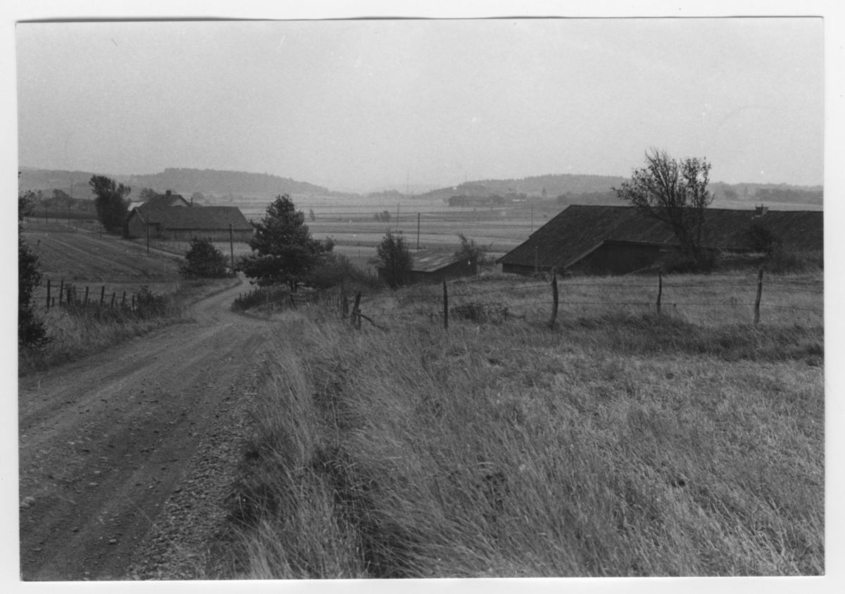 'Bildtext: ''Sedimnetdalgång. Riktning 160.'' I förgrunden öppen mark, åker, staket med taggtråd. Vy ut mot öppna fält, åkrar med grusväg och gårdsbyggnader. :: :: Ingår i serie med fotonr. 6970:1-1125, dokumentation av Hisingens naturgeografi, visande landskapsformerna i stora drag och gjord inför exploateringen av området. Platserna för fotograferingen finns utsatta på karta i skala 1:4000 som finns på Göteborgs Naturhistoriska musem. Fotoriktningen mättes med kompass i gammalgrader.'