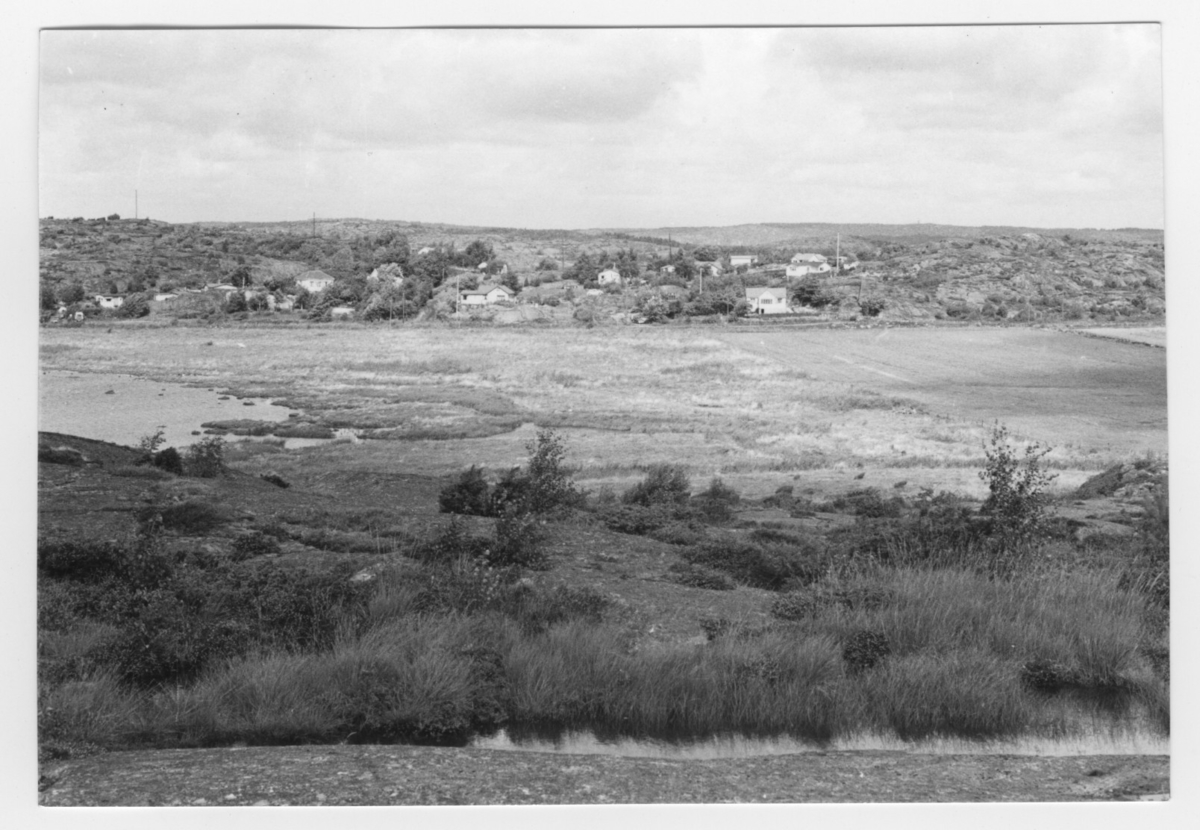 'Bildtext: ''Sedimentdalgångs mynning. Strandäng. Riktning 352.'' :: Vy över strandparti till havet med berghäll sluttande ner mot strandäng i sedimentdalgången. På avstånd syns hus. :: :: Ingår i serie med fotonr. 6970:1-1125, dokumentation av Hisingens naturgeografi, visande landskapsformerna i stora drag och gjord inför exploateringen av området. Platserna för fotograferingen finns utsatta på karta i skala 1:4000 som finns på Göteborgs Naturhistoriska musem. Fotoriktningen mättes med kompass i gammalgrader.'