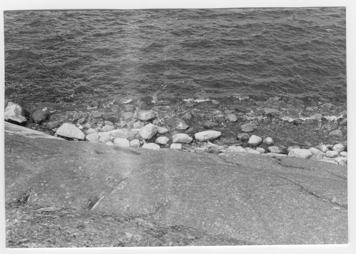 'Bildtext: ''Rundade stenar vid brant klippkust. Riktning 330.'' :: Ansamling av stenblock liggande i vattenbrynet invid berghäll. :: :: Ingår i serie med fotonr. 6970:1-1125, dokumentation av Hisingens naturgeografi, visande landskapsformerna i stora drag och gjord inför exploateringen av området. Platserna för fotograferingen finns utsatta på karta i skala 1:4000 som finns på Göteborgs Naturhistoriska musem. Fotoriktningen mättes med kompass i gammalgrader.'