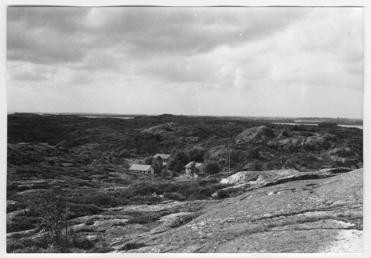 'Bildtext: ''Rundhällandskap. Riktning 236.'' :: Vy över bergällar med ljungvegetation, i lägre parti på rundhällen ligger hus, stuga. :: :: Ingår i serie med fotonr. 6970:1-1125, dokumentation av Hisingens naturgeografi, visande landskapsformerna i stora drag och gjord inför exploateringen av området. Platserna för fotograferingen finns utsatta på karta i skala 1:4000 som finns på Göteborgs Naturhistoriska musem. Fotoriktningen mättes med kompass i gammalgrader.'