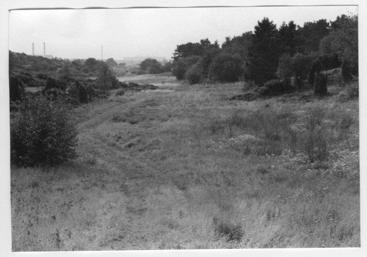 'Bildtext: ''Sedimentdal. Riktning 192.'' :: Vy med öppet fält i sedeimentdalgång. :: :: Ingår i serie med fotonr. 6970:1-1125, dokumentation av Hisingens naturgeografi, visande landskapsformerna i stora drag och gjord inför exploateringen av området. Platserna för fotograferingen finns utsatta på karta i skala 1:4000 som finns på Göteborgs Naturhistoriska musem. Fotoriktningen mättes med kompass i gammalgrader.'