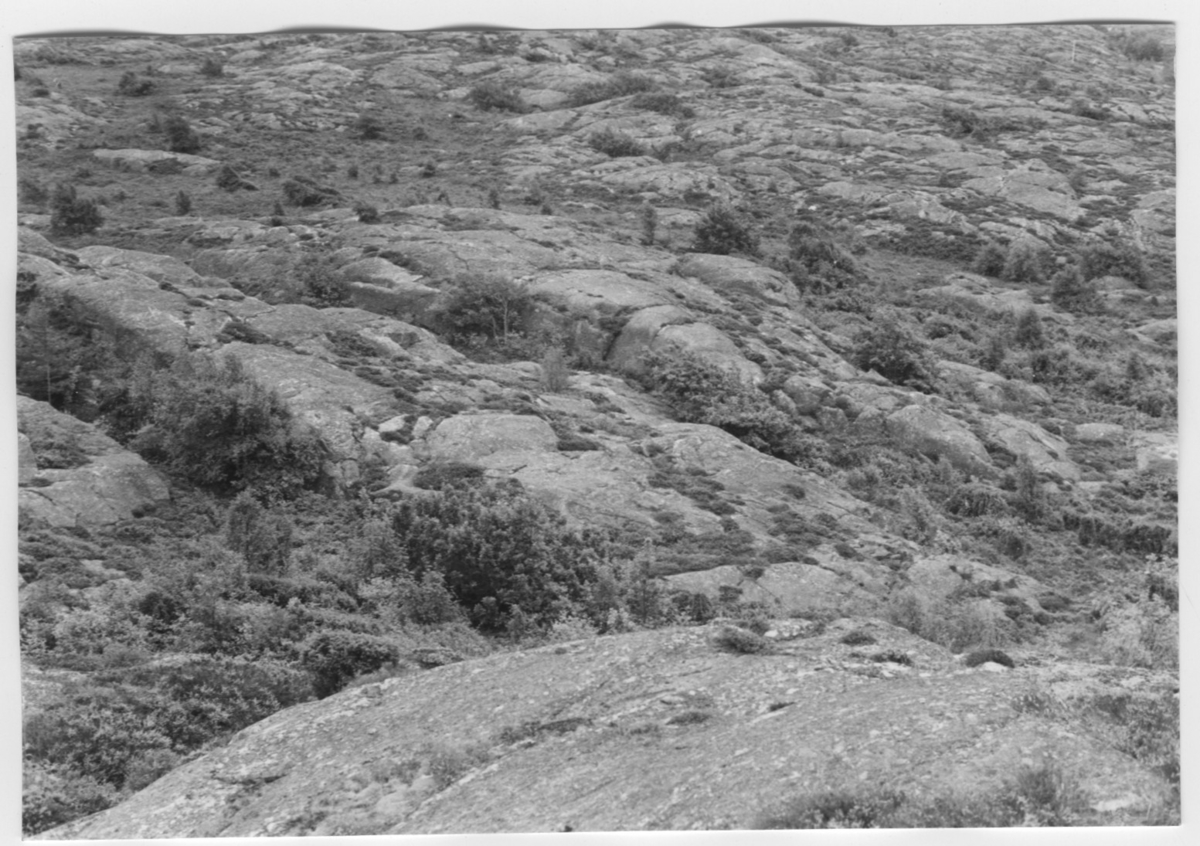 'Bildtext: ''Hällparti. Sprickorna är ett karakteristiskt inslag. Riktning 180.'' Vy ner mot berghäll med träd och buskbevuxna sprickor. :: :: Ingår i serie med fotonr. 6970:1-1125, dokumentation av Hisingens naturgeografi, visande landskapsformerna i stora drag och gjord inför exploateringen av området. Platserna för fotograferingen finns utsatta på karta i skala 1:4000 som finns på Göteborgs Naturhistoriska musem. Fotoriktningen mättes med kompass i gammalgrader.'