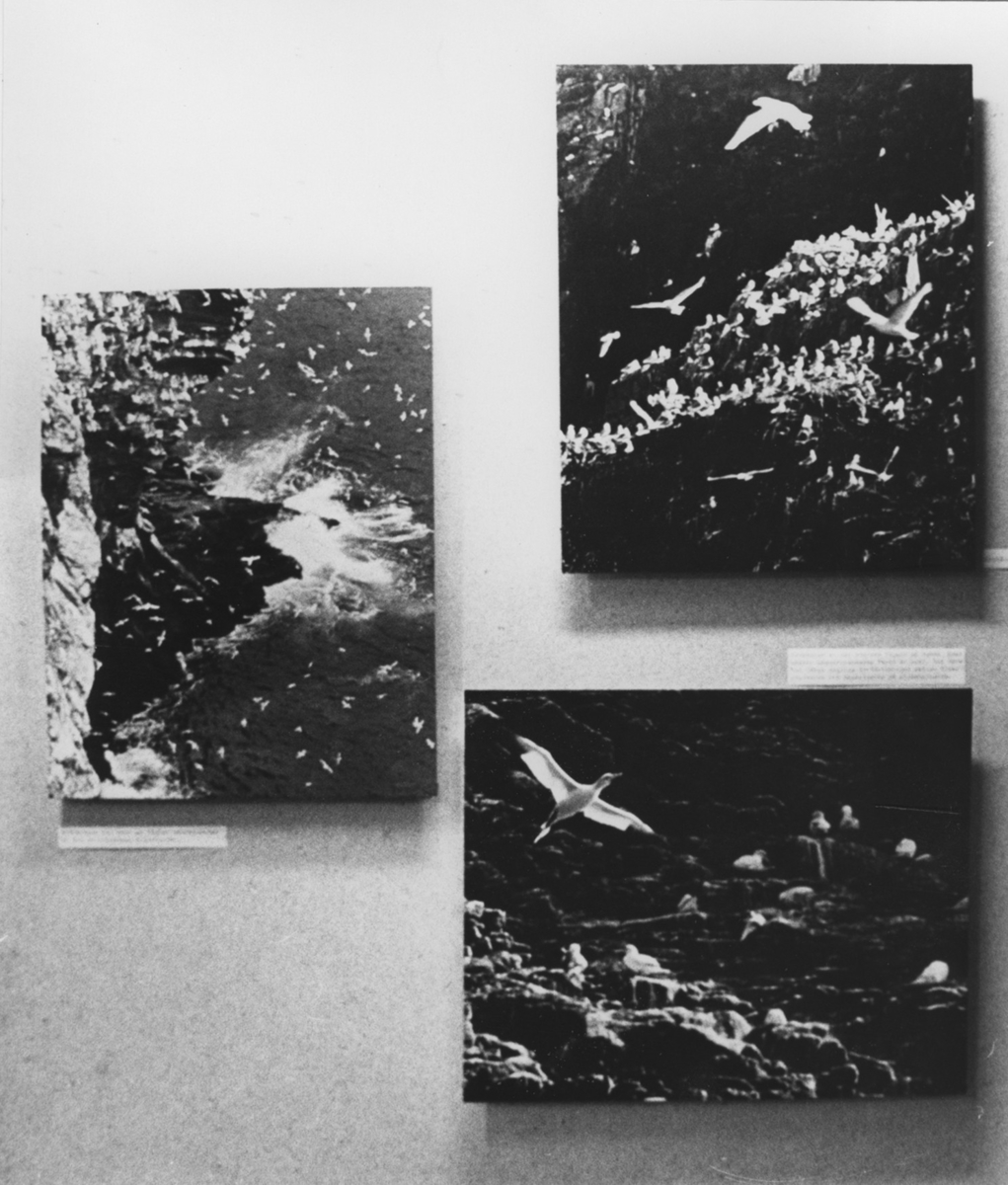 'Avfotografering av utställningen: Rundøy -fågelö på Skandinaviens västkant, 1966-10-22-1966-12-15: :: :: 3 st fotografier på utställningsskärmar visande fåglar, fågelberg och klippor vid havet. :: :: Ingår i serie med fotonr. 6982:1-19.'