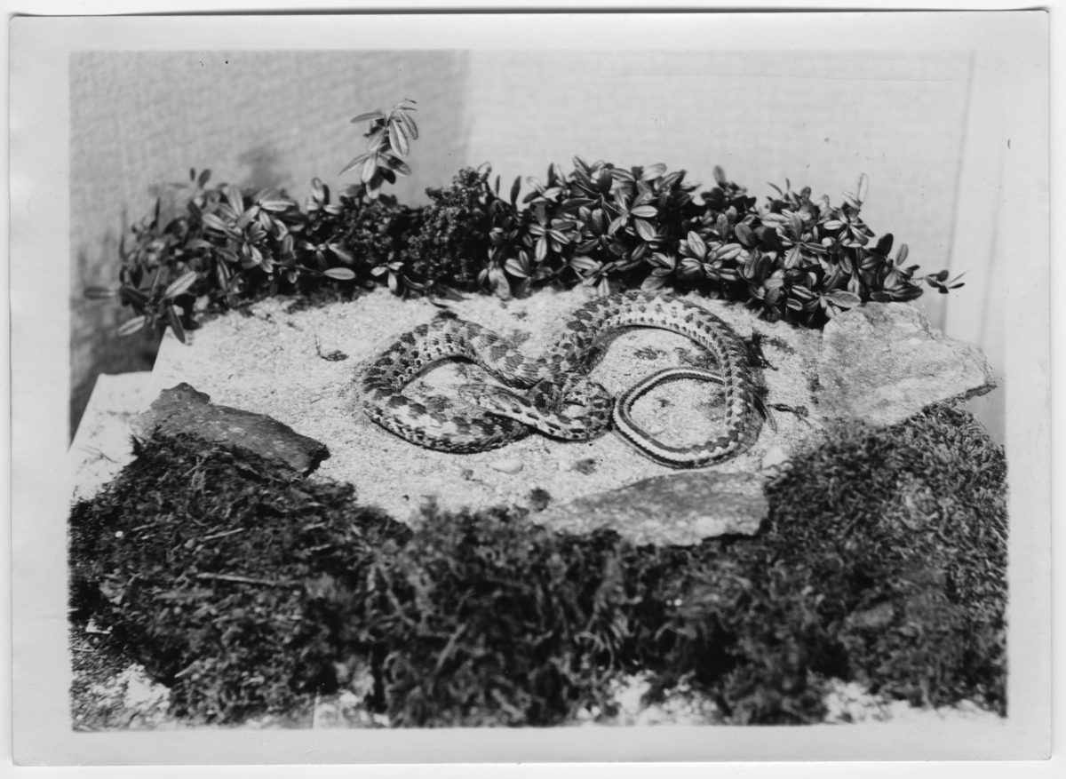 '1 snok, enligt bildtext en mycket sällsynt snok i främre Asien framför allt intressant för sin huggormsliknande teckning. :: :: Ingår i serie med fotonr. 7015:1-91 med bilder av reptiler från Otto Cyréns samling.'