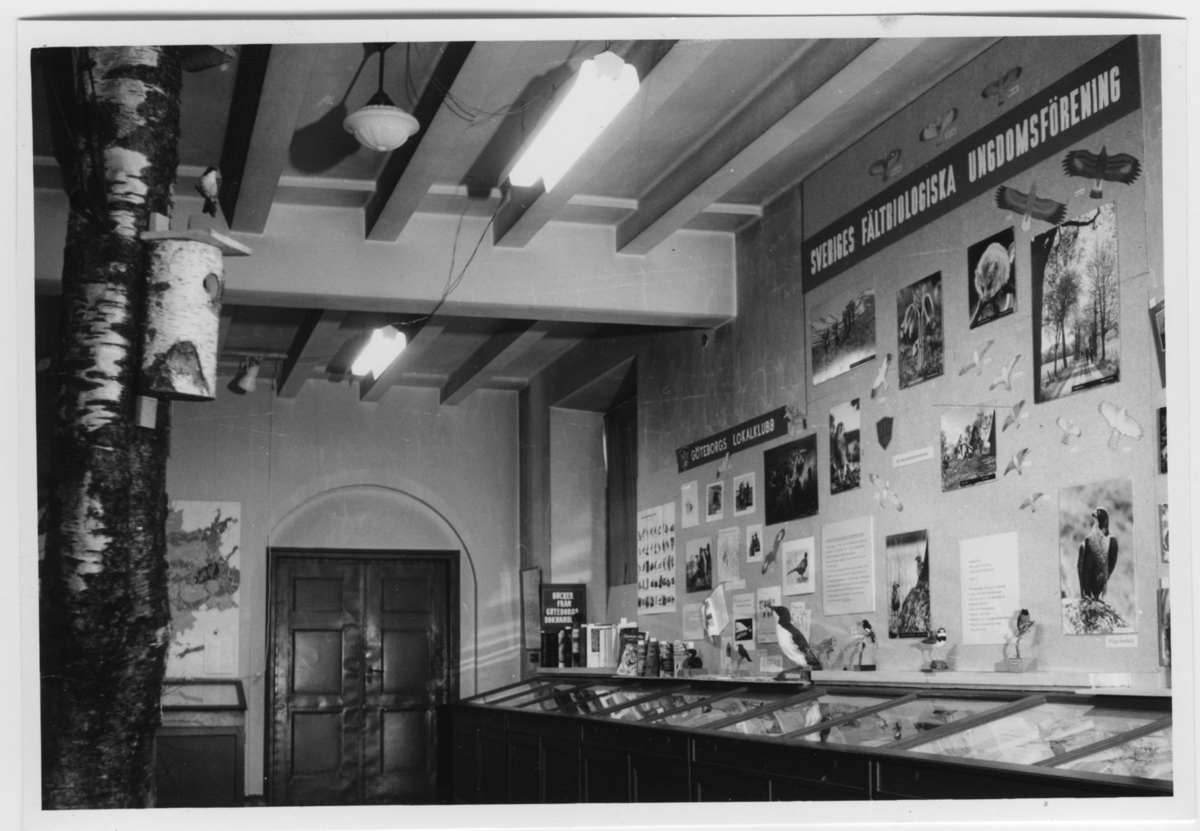 'Vägg med texter och bilder med olika fåglar, även monterade fåglar. Nedanför trämontrar med glaslock. Titel ''Sveriges Fältbiologiska Ungdomsförening'' och ''Göteborgs Lokalklubb''. Björk med fågelholk monterad i rummet. :: :: Ingår i serie med fotonr. 6983:1-22.'