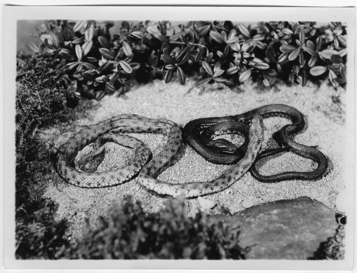 '2 vattensnokar. Enligt bildtext den vanliga vattensnokens närmaste släkting i sydöstra Europa. Den svarta är från Persien. :: :: Ingår i serie med fotonr. 7015:1-91 med bilder av reptiler från Otto Cyréns samling.'