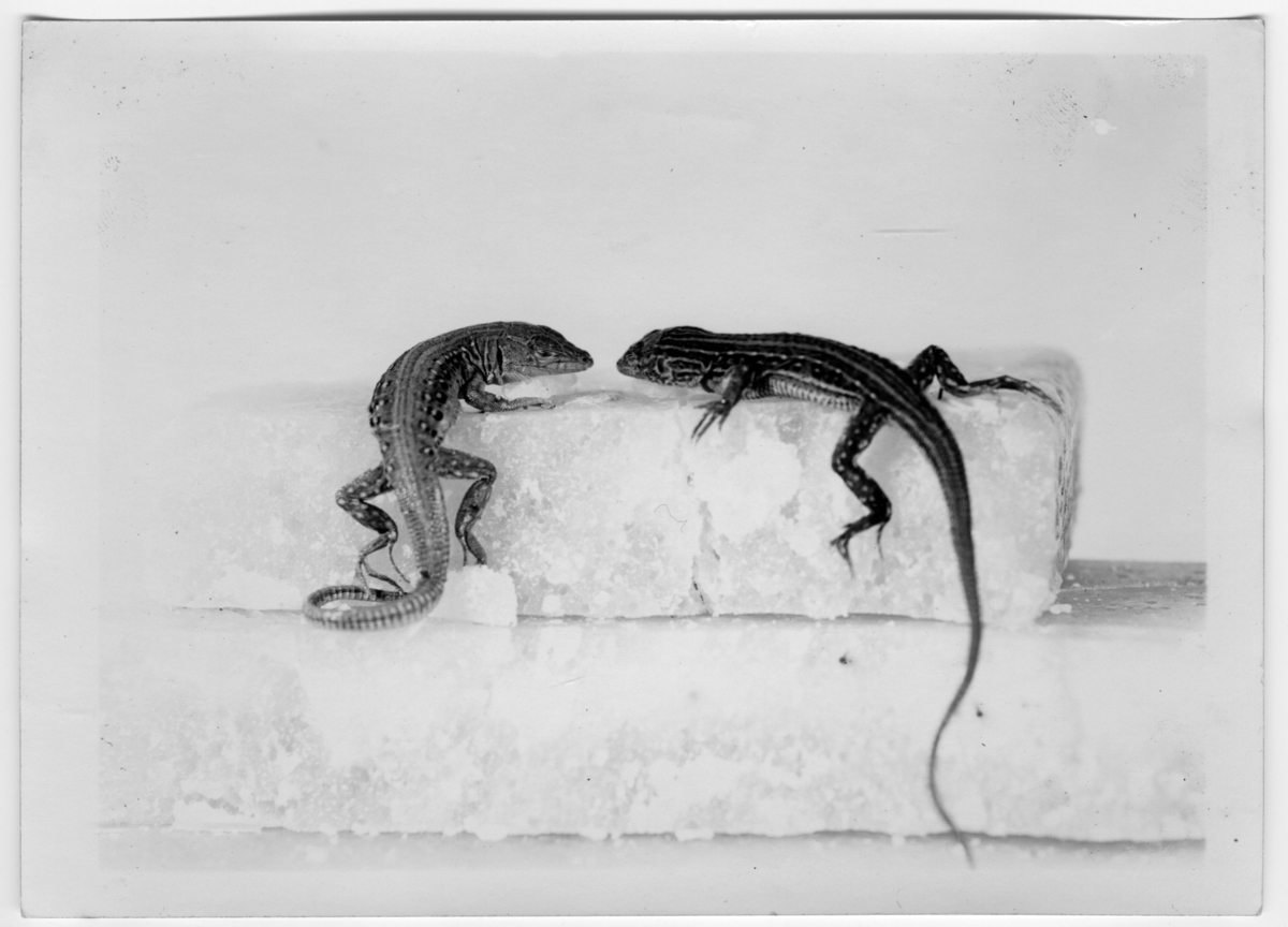 '2 ödlor, hona och hane. :: :: Ingår i serie med fotonr. 7015:1-91 med bilder av reptiler från Otto Cyréns samling.'