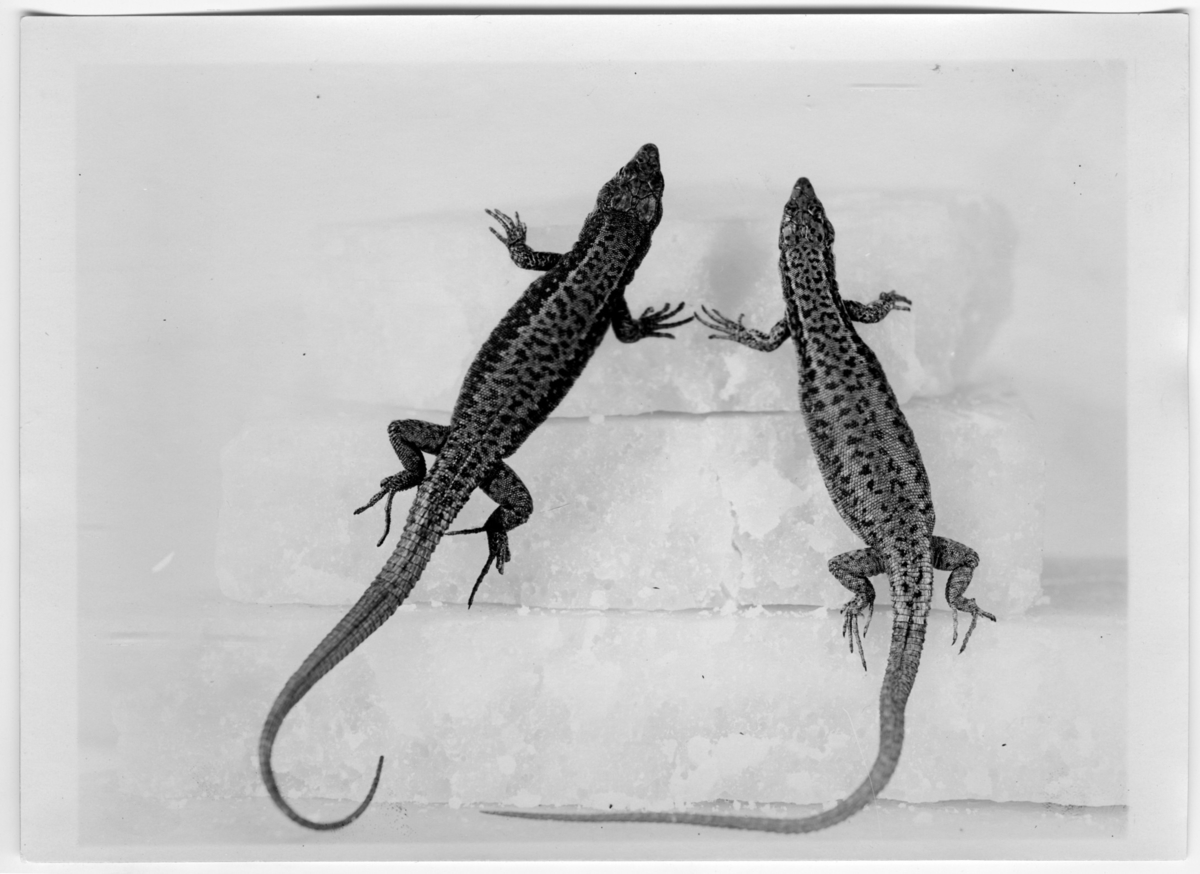 '2 ödlor, hane och hona. Bildtext: ''I främre asien ersätts de europeiska ...?-ödlorna av denna Laenta saxieola som är mycket konstant, icke på långa vägar såvarierande som de ... släkting. :: :: Ingår i serie med fotonr. 7015:1-91 med bilder av reptiler från Otto Cyréns samling.'