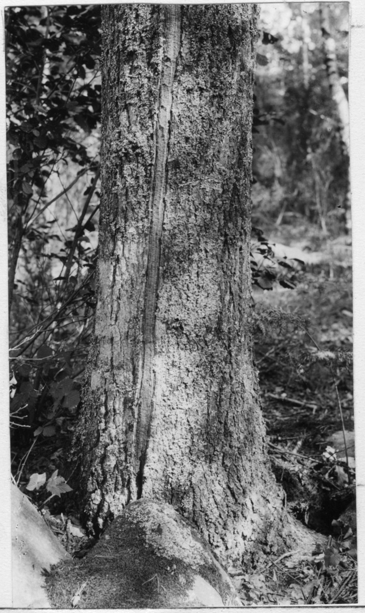 'Bildtext: ''Ek med märke efter åskslag.'' Närbild på skada på ekstam orsakad av åsknedslag. :: :: Fotonr. 7047:2-23 indelad under rubriken ''Atmosfäriska skador på skogen, skogseld och släckning därav.'' Ingår i serie med fotonr. 7046:1-383, 7047:1-33 och 7048:1-67 med bilder från Länsjägmästare John Lindners bildarkiv.'