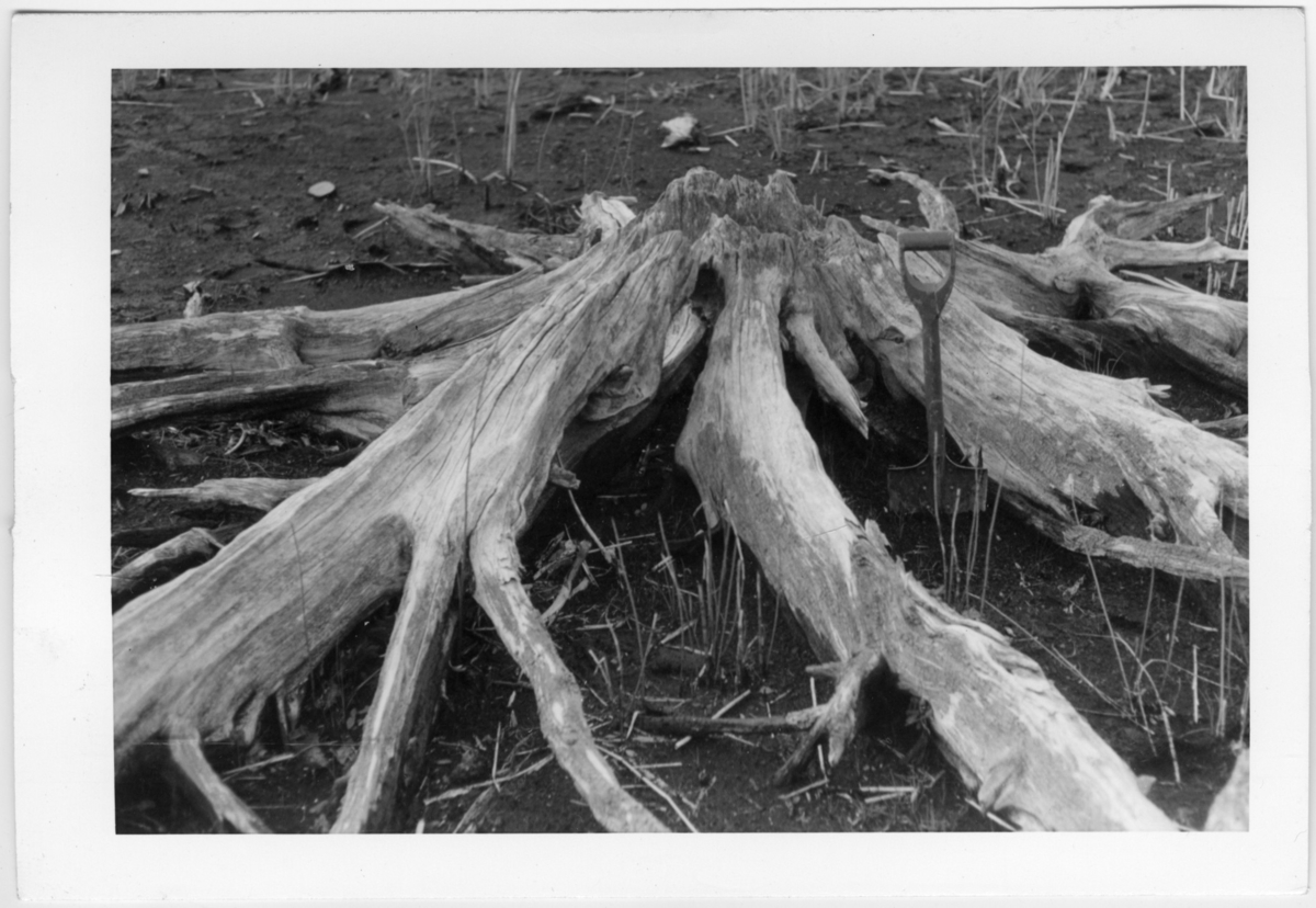 'Närbild på 5000-årig, subfossil tallstubbe. En stubbe finns monterad på väggen på entréplan på Göteborgs Naturhistoriska museum. :: :: Ingår i serie med fotonr. 7051:1-8, se även fotonr 4709 - 4714.'