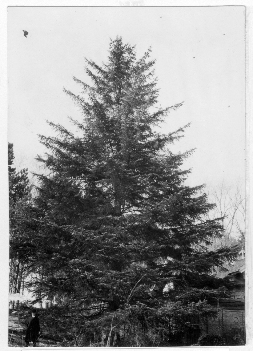 'Bildtext: ''Bild 191. Picea sitchensis, 55 år, 61 cm i diameter vid brösthöjd. Sitkagran, västra Nordamerika.'' Närbild på sitkagran. Hus, tegelbyggnad till höger i bakgrunden. :: :: Fotonr. 7046:186-212 indelade som ''Utländska träd'' i Göteborgs län och Bohus län''. Ingår i serie med fotonr. 7046:1-383, 7047:1-33 och 7048:1-67 med bilder från Länsjägmästare John Lindners bildarkiv.'