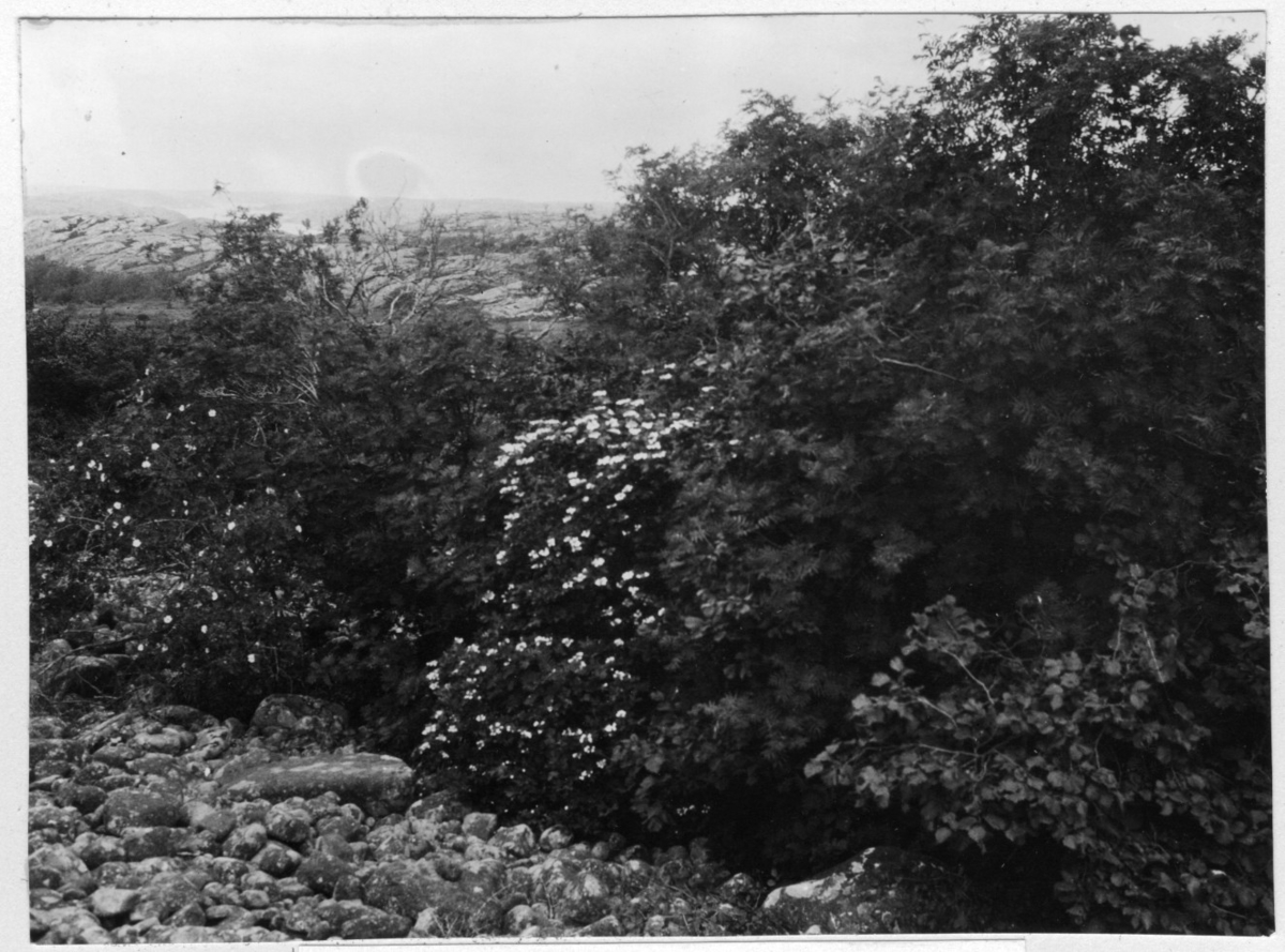 'Bildtext: ''Buskvegetation. Nypon, olvon, liguster, hagtorn, rönn m.m.'' Vy med berghällar och blockmark, buskvegetation i förgrunden. :: :: Fotonr. 7046:213-233 indelade som ''Buskar, blommor m.m.'' i Göteborgs län och Bohus län''.Ingår i serie med fotonr. 7046:1-383, 7047:1-33 och 7048:1-67 med bilder från Länsjägmästare John Lindners bildarkiv.'