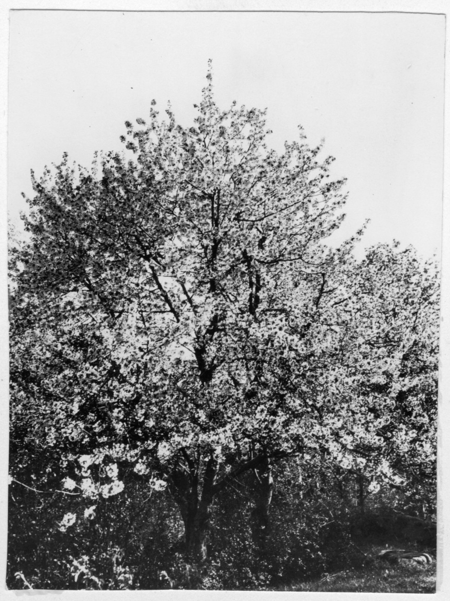 'Bildtext: ''Fågelbärsträd (Prunus avium).'' Närbild på blommande sötkörsbärsträd. :: :: Fotonr. 7046:213-233 indelade som ''Buskar, blommor m.m.'' i Göteborgs län och Bohus län''.Ingår i serie med fotonr. 7046:1-383, 7047:1-33 och 7048:1-67 med bilder från Länsjägmästare John Lindners bildarkiv.'