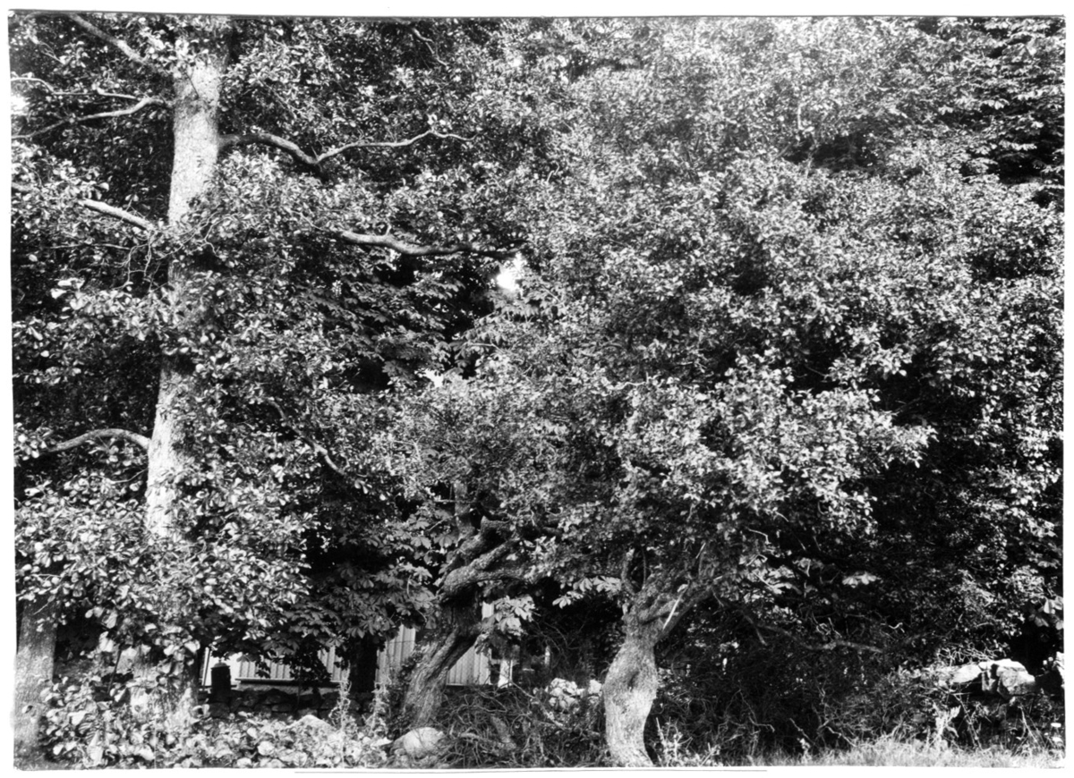'Bildtext: ''Benvedsträd. Evonymus europaea. 45 och 25 cm i diameter.'' Närbild på 2 benvedsträd. Byggnad i fonden :: :: Fotonr. 7046:213-233 indelade som ''Buskar, blommor m.m.'' i Göteborgs län och Bohus län''.Ingår i serie med fotonr. 7046:1-383, 7047:1-33 och 7048:1-67 med bilder från Länsjägmästare John Lindners bildarkiv.'