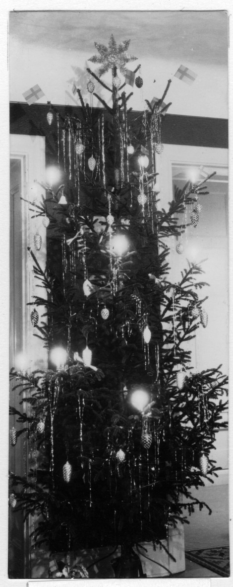 'Bildtext: ''Julgran.'' Närbild på klädd julgran med kottformade julgranskulor och stjärna i toppen samt flaggor och ljus. :: :: Fotonr. 7046:354-368 indelade som ''Virkesförädling, virkets användning.'' Ingår i serie med fotonr. 7046:1-383, 7047:1-33 och 7048:1-67 med bilder från Länsjägmästare John Lindners bildarkiv.'