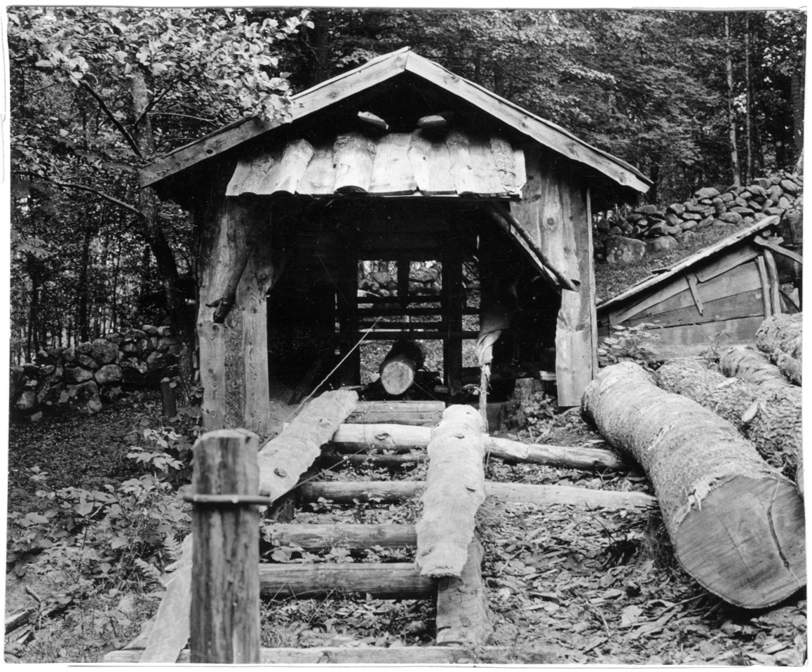 'Bildtext: ''Bild 377. Vattensåg med ram och liggande blad. Uppförd i början av 1900-talet.'' Närbild på sågbyggnation, stenmur i bakgrunden samt trädvegetation. Träindustri. :: :: Fotonr. 7046:354-368 indelade som ''Virkesförädling, virkets användning.'' Ingår i serie med fotonr. 7046:1-383, 7047:1-33 och 7048:1-67 med bilder från Länsjägmästare John Lindners bildarkiv.'