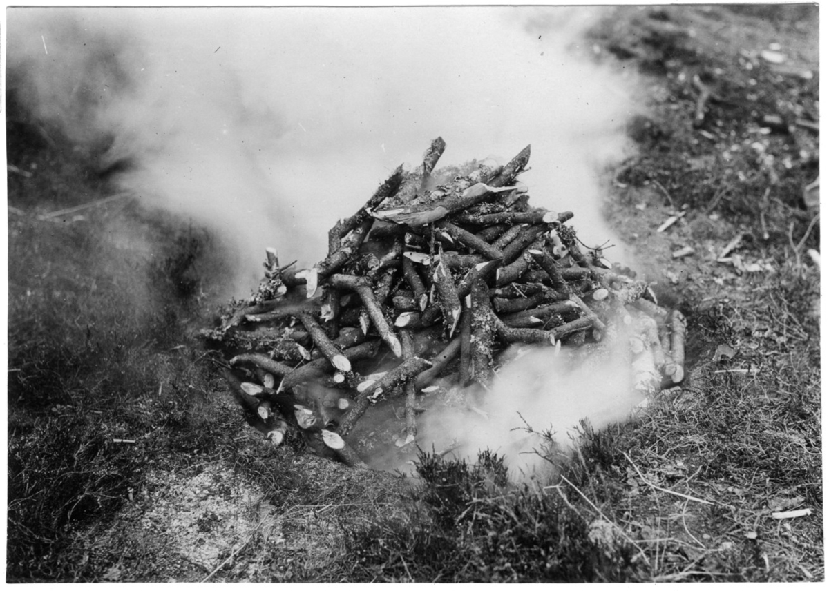'Bildtext: ''Kolning i grop. Gropen fylld med råge.'' Närbild på kolningsgrop fylld med ved. :: :: Fotonr. 7046:369-382 indelade som ''Kolning.'' Ingår i serie med fotonr. 7046:1-383, 7047:1-33 och 7048:1-67 med bilder från Länsjägmästare John Lindners bildarkiv.'