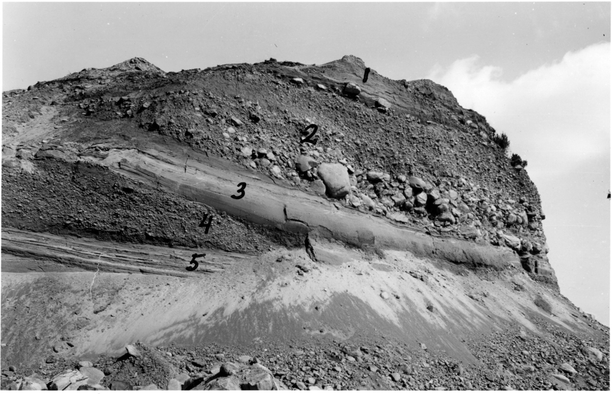 'Närbild på grusavlagringens lagerföljd, markeringar utsatta i bilden. Bildtext: ''Sektion C-D, öster. Fig. 18. '' Grusavlagringens lagerföljd enligt anteckningar: :: 1) Gula sanden :: 2) Andra morän :: 3) Övre grå sanden :: 4) Röda kantiga gruset :: 5) Undre grå sanden :: :: Ingår i serie med fotonr. 7058:1-32.'