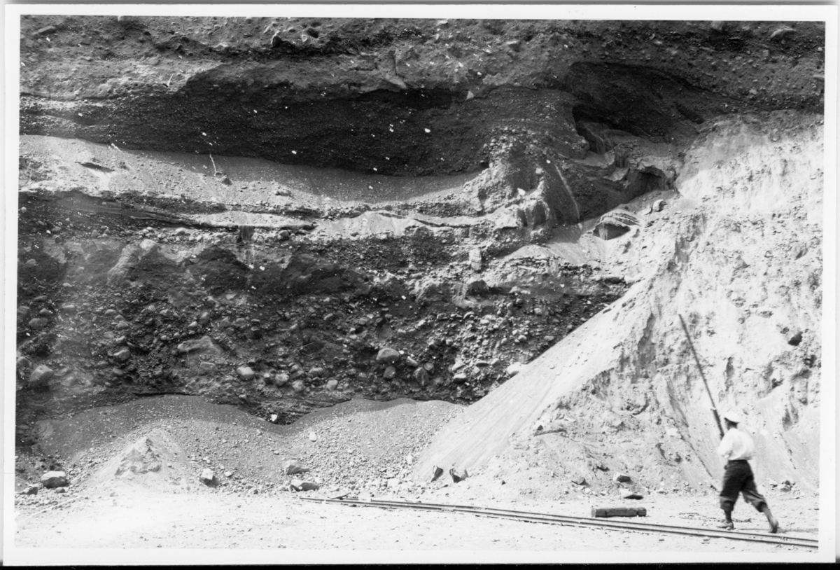 'Vägg i grustaget visande grusavlagringens lagerföljd. 1 person gående på marken vid rälsspår med stav i handen. Bildtext: ''Motsvarar undre morän enligt Alin.'' :: :: Ingår i serie med fotonr. 7058:1-32.'