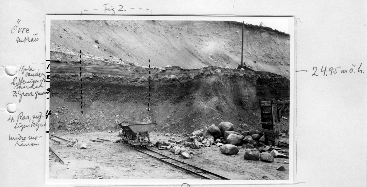 'Vy av en vägg i grustaget. Transportvagn på räls i förgrunden samt stenblock. Bildtext: ''Fig 1. Dösebacka. Profil, gropen omdelebart norr om sydligaste gropen. I gula sanden ovan (2) har hittats ett stort ben som förstörts.'' Anteckningar om grusavlagringens lagerföljd: Övre morän, Gula sanden, steniga grå sanden, grova gruset och nederst ras, möjligen döljande undre moränen. 2495 meter över havet. :: :: Ingår i serie med fotonr. 7058:1-32.'