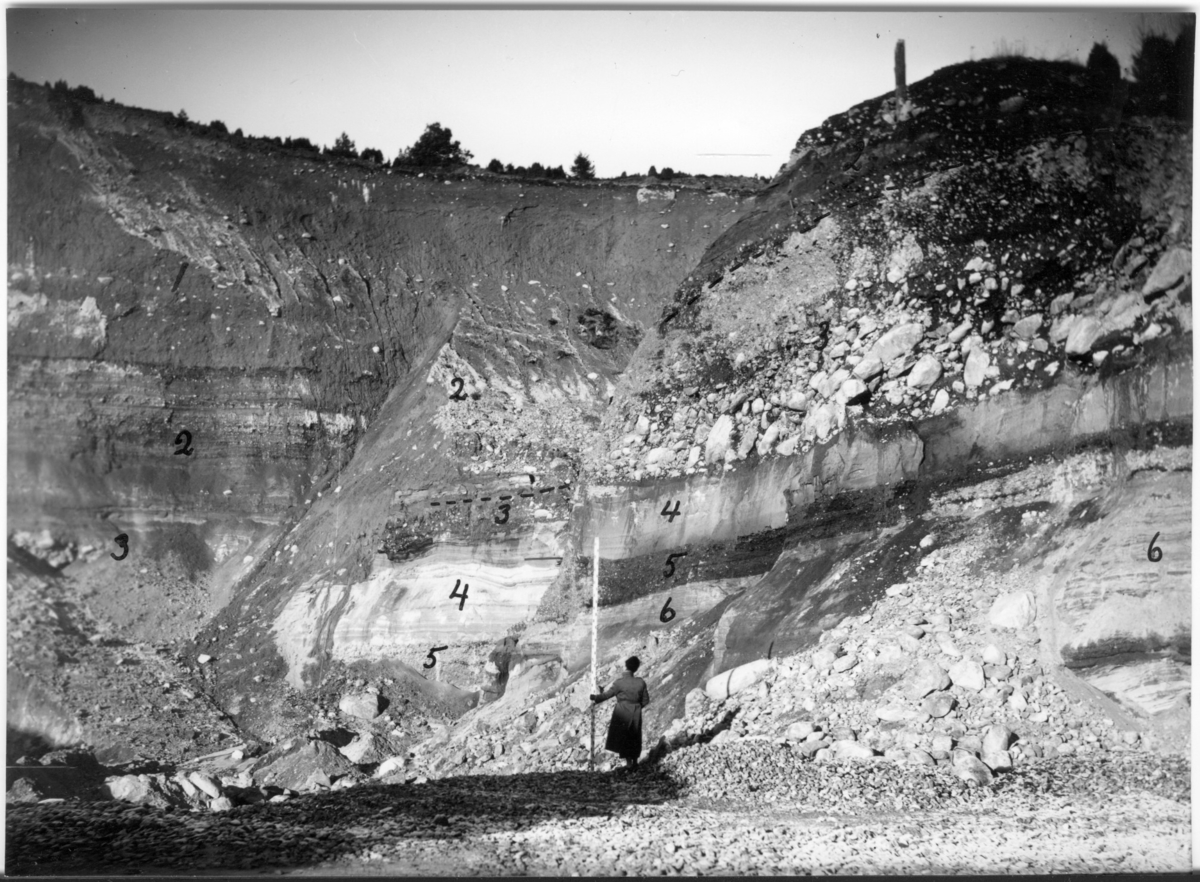 'Översiktsbild av grusavlagringens lagerföljd i ena väggen av grustaget. 1 person stående nere i grustaget med mätstock i handen. :: Bildtext: ''Västra och norra väggen i södra gropens norra schakt. Fig. 9'' ''Dösebacka detalj från södra ändan av platån, norra grusgropen, norra och västra väggen. Väster till vänster i bilden och öster till höger i bilden.'' :: :: På bilden finns siffror utsatta, :: 1 (A1): Översta moränen :: 2 (A4): Gula sanden :: 3 (C-lagret): Andra morän :: 4 (C): Grå sanden :: 5 (D2): Röda kantiga gruset :: 6 (D): Undre grå sanden :: ''Vid 5 - till vänster om avvägningsstången vilar röda kantiga gruset på det oskiktade röda kantiga gruset.'' :: :: Ingår i serie med fotonr. 7058:1-32.'