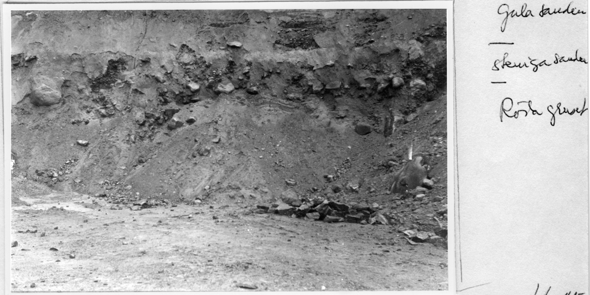'Närbild på grusavlagringens och dess lagerföljd. Bildtext: ''Dösebacka. Detalj visande bandet med den grå steniga sanden. Södra gropen, västra sidan.'' Moränens lagerföljd enligt bildanteckningar, gula sanden, steniga sanden och röda gruset nederst. :: :: Ingår i serie med fotonr. 7058:1-32.'