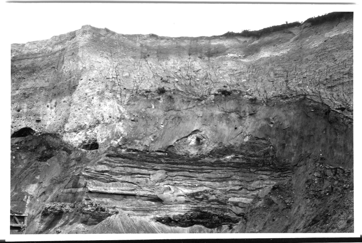 'Närbild på grusavlagringens lagerföljd. Bildtext: ''Öster om stora vecket.'' Moränens lagerföljd enligt bidlens anteckningar, Grå morän, gula sanden, steniga grå sanden och röda gruset nederst till vänster i bilden. Grå morän, gula sanden och steniga grå sanden nederst till höger i bilden. :: :: Ingår i serie med fotonr. 7058:1-32.'