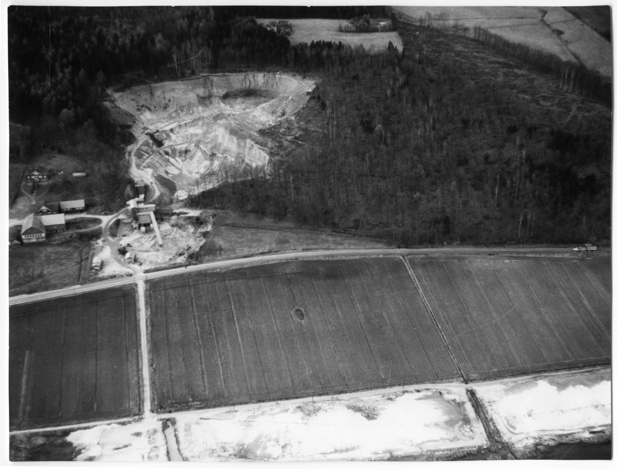 'Flygfoto över ev. Dösebacka grustaget med intilliggande anläggning. Vägar, åkermark, gård och skog. :: :: Text på baksidan: 57:4 :: Försvarsstaben. Granskad och tillåten för försäljning, saluhållning, utdelning och utförsel jämlikt Kungl. Kungörelsen den 31 aug 1940 (nr 802). :: :: Ingår i serie med fotonr. 7061:1-14. Serien består av material från Åke Hillefors (inkommet 2004).'