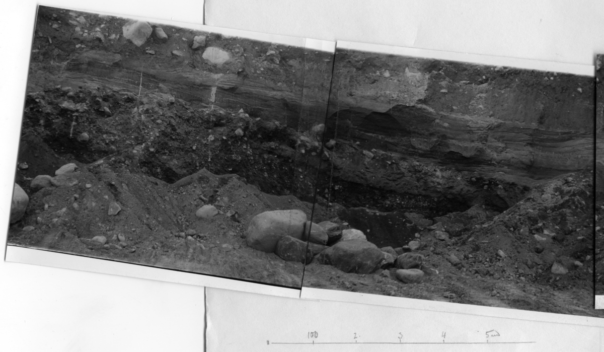 'Bildtext: pil till vänster. Tryck från N-NNV. Isberg? Knappast is med tanke på glaci fluvial sand. Se fotonr. 7061:4-6 för hel profil ev. i Dösebacka sandtaget. Bildserien sitter ihop från vänster med bild 7061:4 till höger med bild nr. 7061:5 och längst till höger fotonr. 7061:6. :: :: Ingår i serie med fotonr. 7061:1-14. Serien består av material från Åke Hillefors (inkommet 2004).'