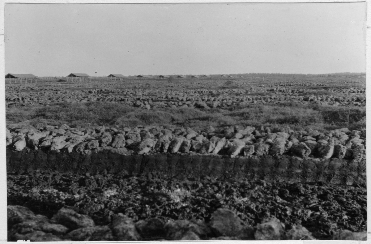 'Bildtext: ''Torvströtäkt.'' Vy över torvtäkt. Skjul med enbart tak på rad invid området. :: :: Fotonr. 7048:38-41 indelad under rubriken ''Skogens historia i sydvästra Sverige under förhistorisk tid''. Ingår i serie med fotonr. 7046:1-383, 7047:1-33 och 7048:1-67 med bilder från Länsjägmästare John Lindners bildarkiv.'