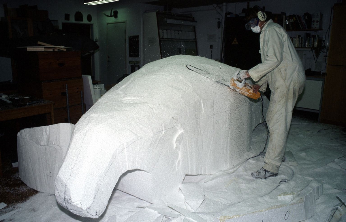 'Putsning med motorsåg av kroppen till sjökomodellen, i cellplast. :: Bildtext i Årstryck: ''Grovformerna av det nästan fem meter långa cellplastblocket skulpteras med motorsåg. Därefter förfinas detaljerna med kebabkniv, rasp och sandpapper.'' :: :: Bilden med i Göteborgs Naturhistoriska Museums Årstryck 2005 s. 71. :: :: Bilder från arbetet med att konstruera en modell av Stellers sjöko utifrån beskrivning gjord av Georg Wilhelm Steller 1742. :: :: Modellen föreställer en ung hona som är nästan 5 meter lång och står utställd längst in i valsalen på Göteborgs Naturhistoriska Museum (2008-0124). :: :: Ingår i serie med fotonr. 7101:1-35.'