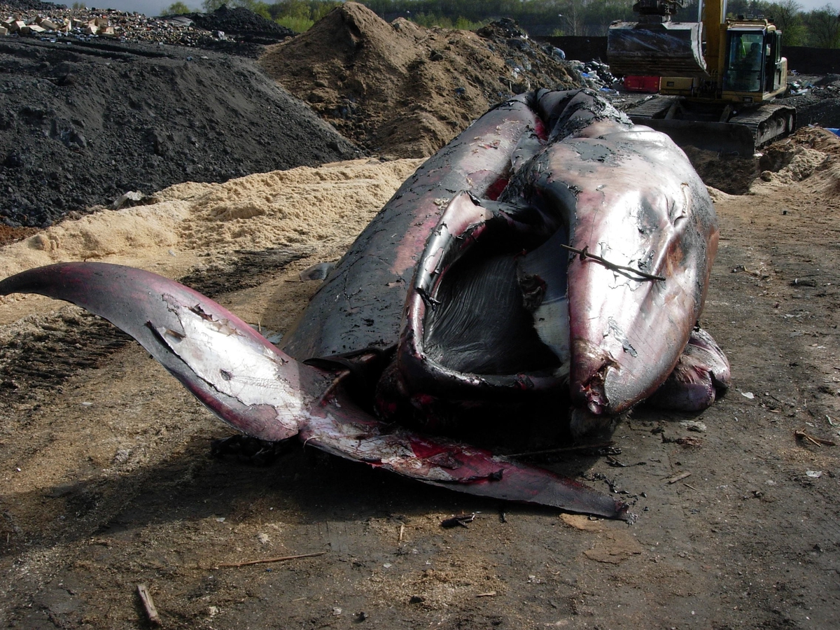 'Bilder på en död sillval innan den grävdes ner: :: Sillvalens kropp dubbelvik med stjärtfenan mot kameran. :: :: Ingår i serie med fotonr. 7107:1-5.'