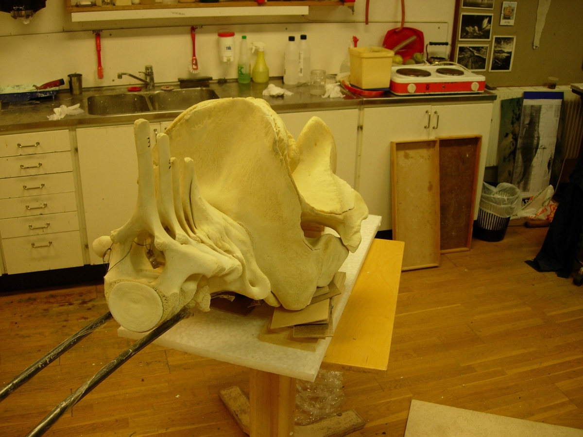 'Ateljen, Monteringsarbetet med näbbvalen, hane, Valders skelett. :: Kranium med ställning för ryggraden, sett bakifrån. :: :: Skelettet till näbbvalen är monterat och hänger i valsalen på Göteborgs Naturhistoriska Museum. Då näbbvalen sågs utmed kusten kom den att kallas Valder i media. :: :: Ingår i serie med fotonr. 7106 med bilder på näbbvalen som levande och under arbetet med att montera skelettet.'