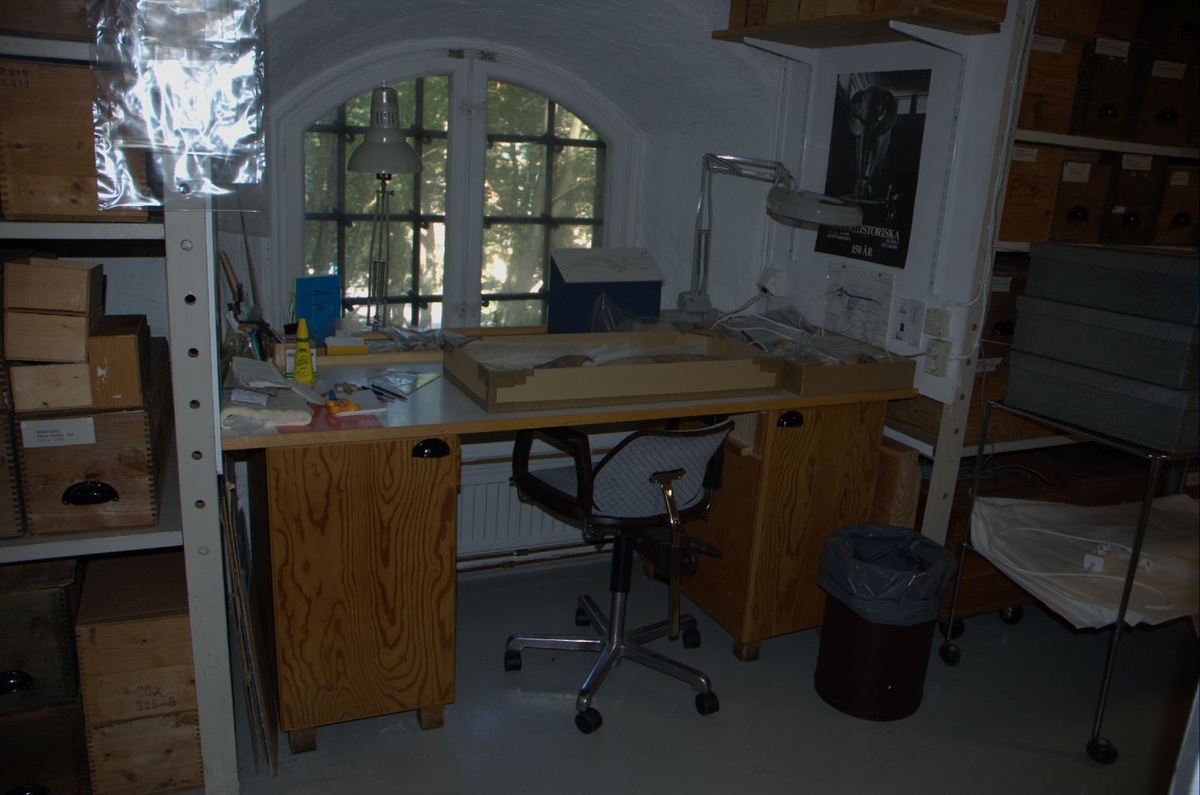 'Arbetsplats i benkällaren. :: :: Fotonr. 7095 består av en bildserie som dokumenterar diverse utrymmen i byggnaden så som kontor, arbetsplatser, arbetsrum, magasin m.m. Bilder tagna före och efter olika ombyggnationer bl.a.'