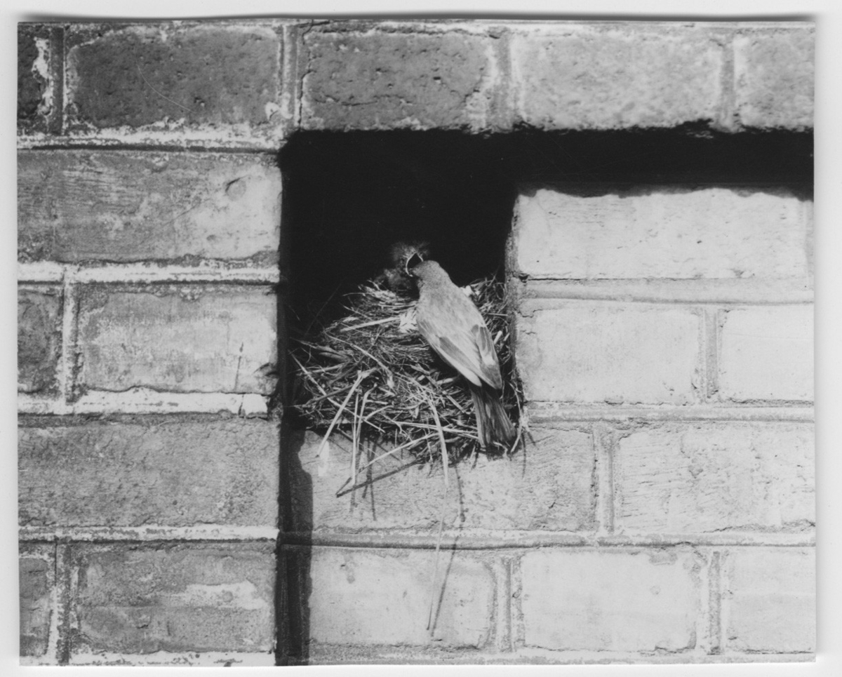 'Svart rödstjärt, hane med bo och ungar, i en murad vägg. :: :: Ingår i serie med fotonr. 709-713.'