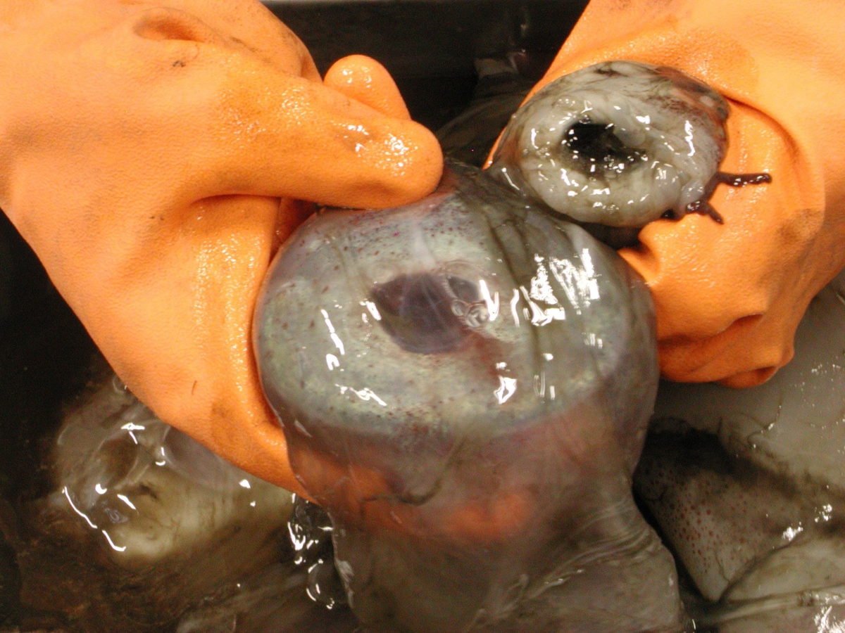 'Bilder på bläckfisken Haliphron atlanticus. :: Närbild på öga (till vänster) och tratt (högra). :: :: Ingår i serie med fotonr. 7104:1-3.'