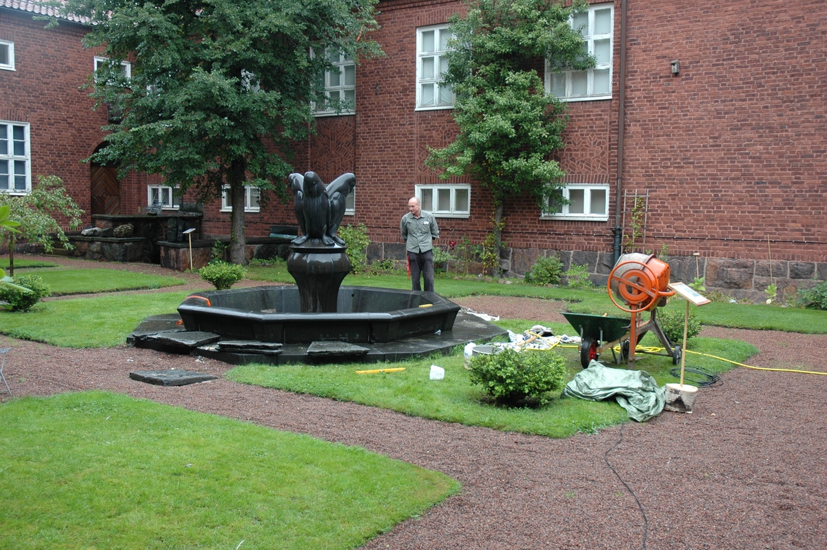 'Vy av innergården med fontänen som är under reparation. :: :: Fotonr. 7095 består av en bildserie som dokumenterar diverse utrymmen i byggnaden så som kontor, arbetsplatser, arbetsrum, magasin m.m. Bilder tagna före och efter olika ombyggnationer bl.a.'