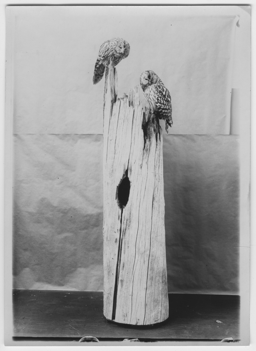 'Bo av slaguggla med hane och hona med bo. Montering i trädstam. :: :: Bilden finns med i Göteborgs Naturhistoriska Museums Årstryck 1930 s. 24.'