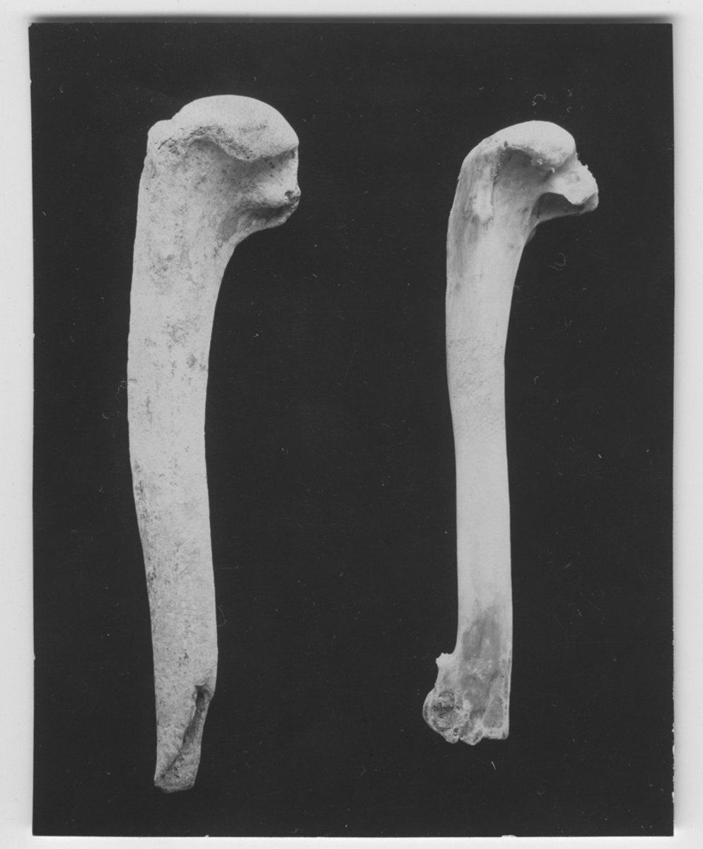 'Vänstra benet: Stycke av överarmsben av garfågel och tordmule. Sotenäskanalen 1932. Högra benet: motsvarande ben av tordmule. :: :: Ingår i serie med fotonr. 2984-3010, foton och teckningar på dront och garfågel bl.a.'