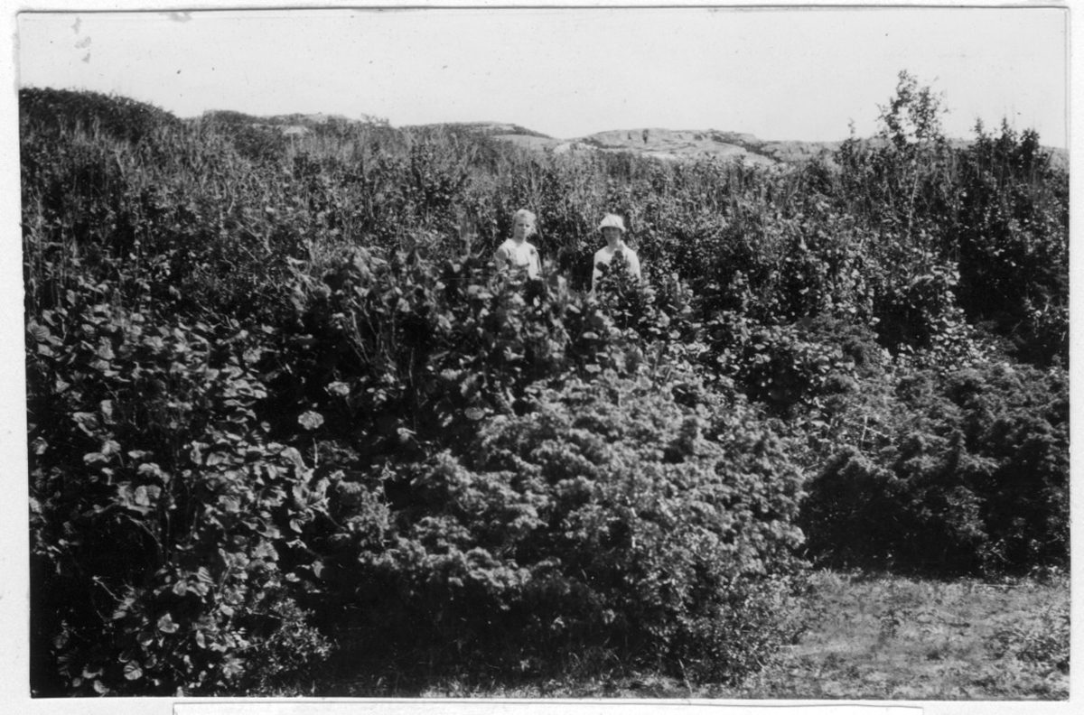 'Bildtext: ''Lågvuxen hasselskog.'' 2 kvinnor stående bland bestånd av hassel. Berghällar i fonden. :: :: Fotonr. 7046:213-233 indelade som ''Buskar, blommor m.m.'' i Göteborgs län och Bohus län''.Ingår i serie med fotonr. 7046:1-383, 7047:1-33 och 7048:1-67 med bilder från Länsjägmästare John Lindners bildarkiv.'