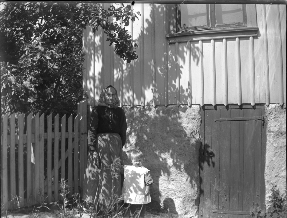 'Bildtext: ''Kyrkesund 1927.'' :: Vy med 1 gammal kvinna och ett litet barn, flicka, stående vid husgrunden till ett trähus, framför staket. Klädsel. :: :: Ingår i serie med fotonr. 5228:1-11.'