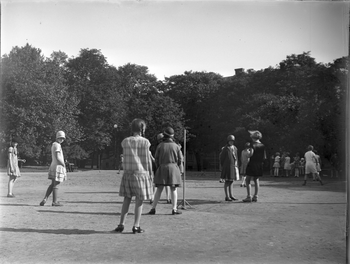 'Vy med ca 10 flickor på idrottsplan i förgrunden, iklädda klännning, rock, hatt. I bakgrunden ytterligare flickor. Vid kanten träd. På en bänk sitter en man med käpp och hatt. I bakgrunden skymtar husfasad med texten ''Glasmästeri verkstad...'' synlig. :: :: Ingår i serie med fotonr. 5228:1-11.'